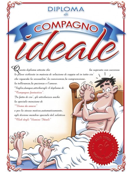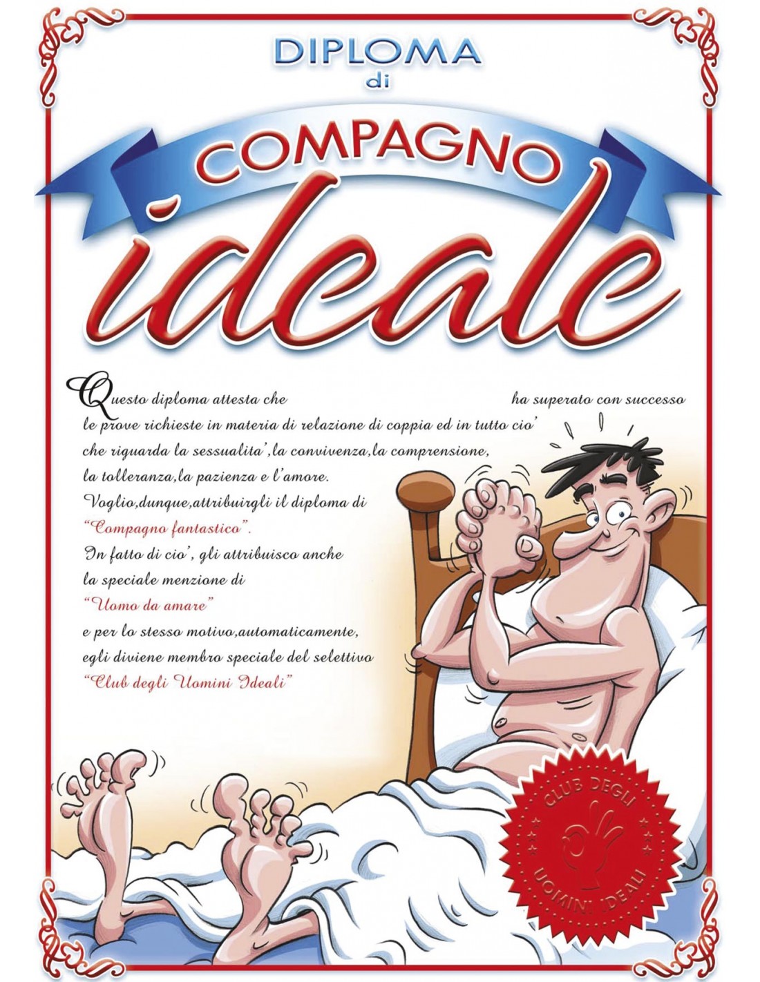 Il Diploma di Compagno ideale è stampato su cartoncino patinato contenuto in una scatola di cartone, completa di nastro di raso per poter, dopo averlo arrotolato, annodarlo con un bel fiocco