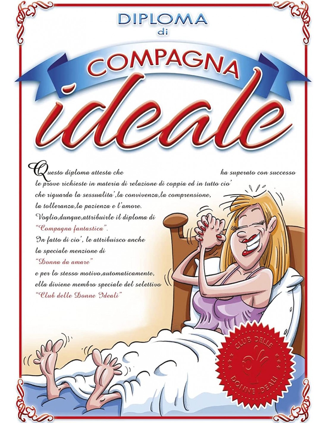 Il Diploma di Compagna ideale è stampato su cartoncino patinato contenuto in una scatola di cartone, completa di nastro di raso per poter, dopo averlo arrotolato, annodarlo con un bel fiocco