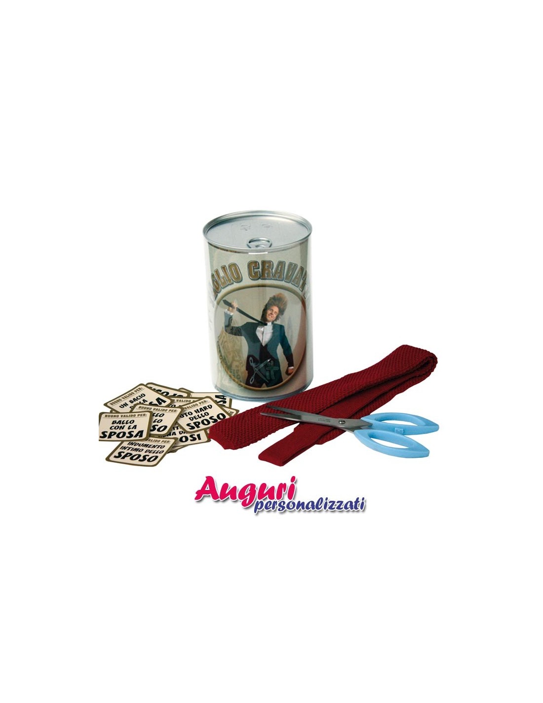 Per una coppia di innamorati il giorno del proprio matrimonio è considerato il più bello della vita, ma lo stesso non si può dire per la cravatta del consorte. La tradizione del taglio della cravatta è sempre più in auge tra gli scherzi da fare al proprio amico. Proprio per "salvare" il costosissimo accessorio è pensato il kit per il taglio della cravatta dello sposo. La cravatta che verrà fatta a pezzi e "venduta" agli invitati non sarà l'originale ma una contenuta appositamente nel kit.