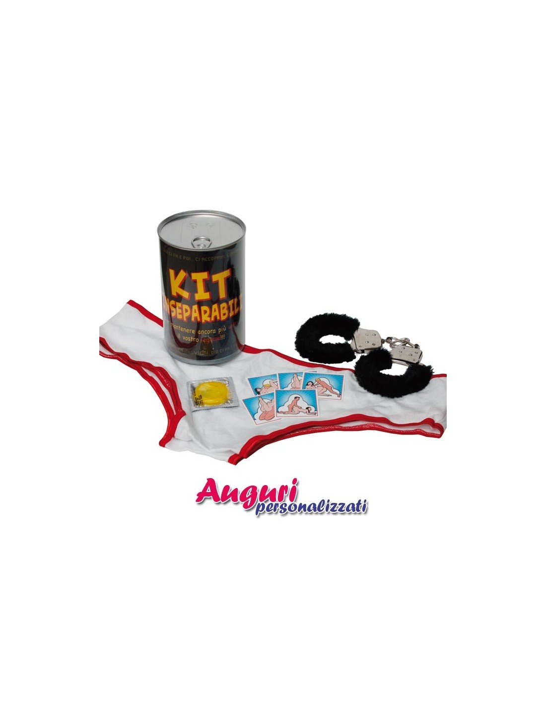 Se acquisterai il kit per matrimonio "inseparabili" riceverai a casa un adorabile barattolo di 10 x 15 cm nero e con apertura a strappo. All'interno troverai dei simpatici gadget per rendere divertente e diversa dal solito la tua vita di coppia; dei fantastici preservativi colorati e profumati per vivere i tuoi momenti in compagnia del partner in tutta sicurezza, delle manette ricoperte da una divertente pelliccia di colore nero, delle simpatiche mini illustrazioni delle posizioni del kamasutra e per finire un paio di slip a quattro gambe adatto per essere indossato dalla coppia.