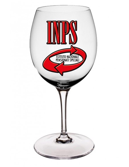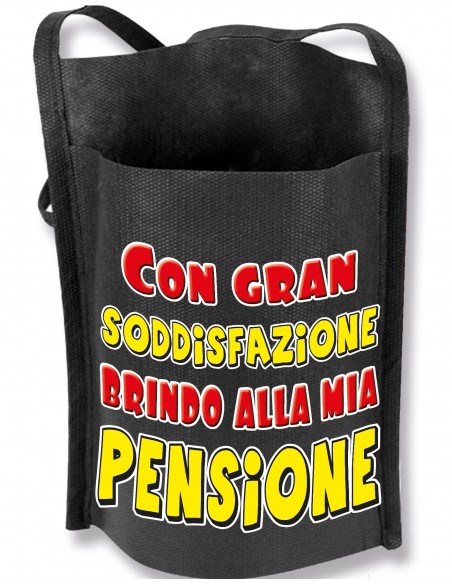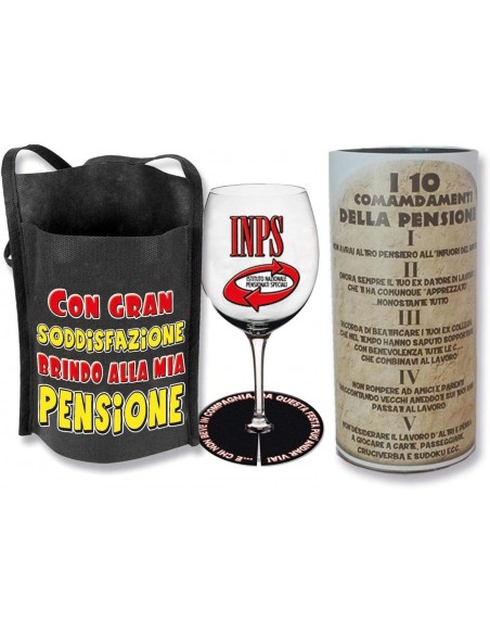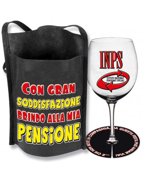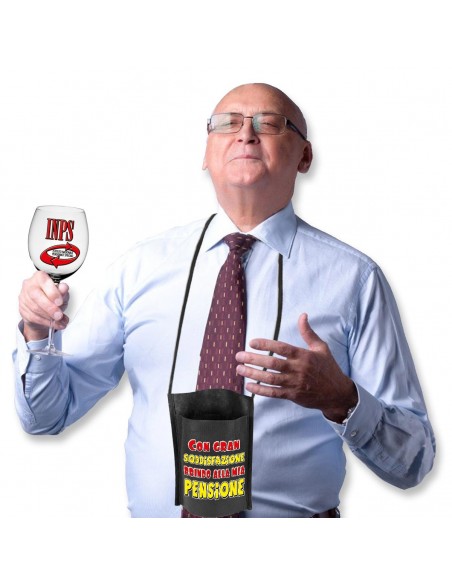 Appendi al collo del protagonista della serata questa busta in TNT porta bicchiere stampata con la frase "Con gran soddisfazione, brindo alla mia Pensione", che contiene il calice in vetro da 300 mi., con l’ironica sigla INPS, completa il tutto, un divertente disco salva goccia, da inserire alla base del bicchiere.