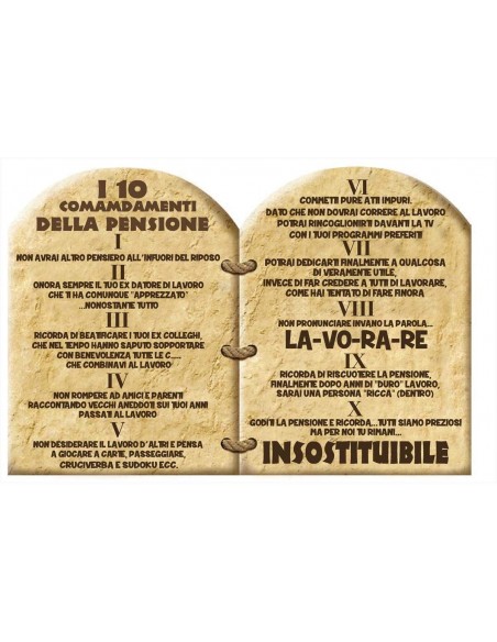 Il set e' confezionato all'interno di un cilindro di cartone stampato con i "10 Comandamenti della Pensione"