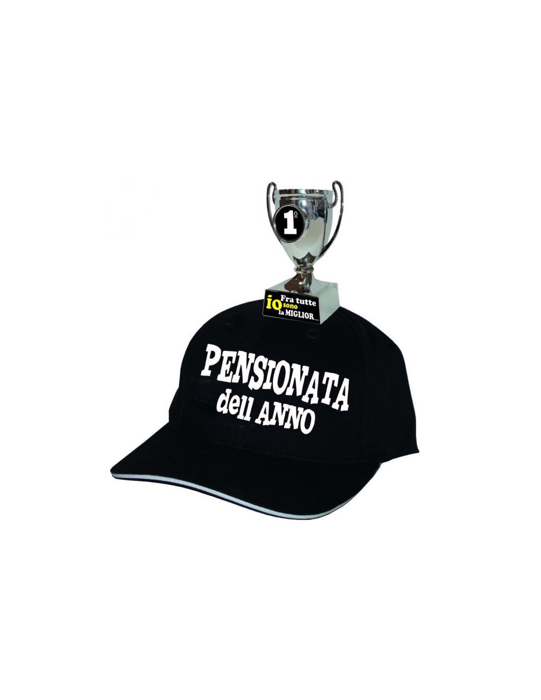 Sara' sicuramente impossibile trovare un'idea piu' strana e stravagante per una neo-Pensionata, di questo cappellino con applicata alla sommita', una piccola coppa trofeo con una prima parte di dedica ''IO fra tutte sono la migliore...'' e stampata sulla parte frontale del berrettino, il finale della dedica " Pensionata dell'anno"
