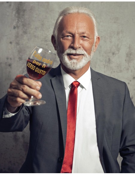 All’interno del tubo in cartone avana, protetto da un imballaggio in paglia di legno naturale, ecco la sorpresa …il calice “ubriaco” portafortuna con applicata la dedica TUTTO ANDRA’ PER IL VERSO GIUSTO