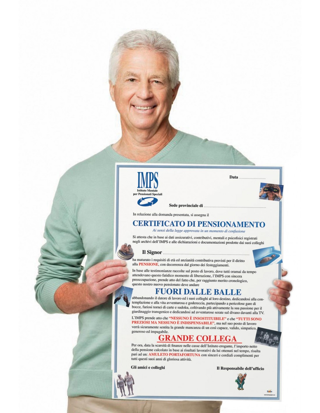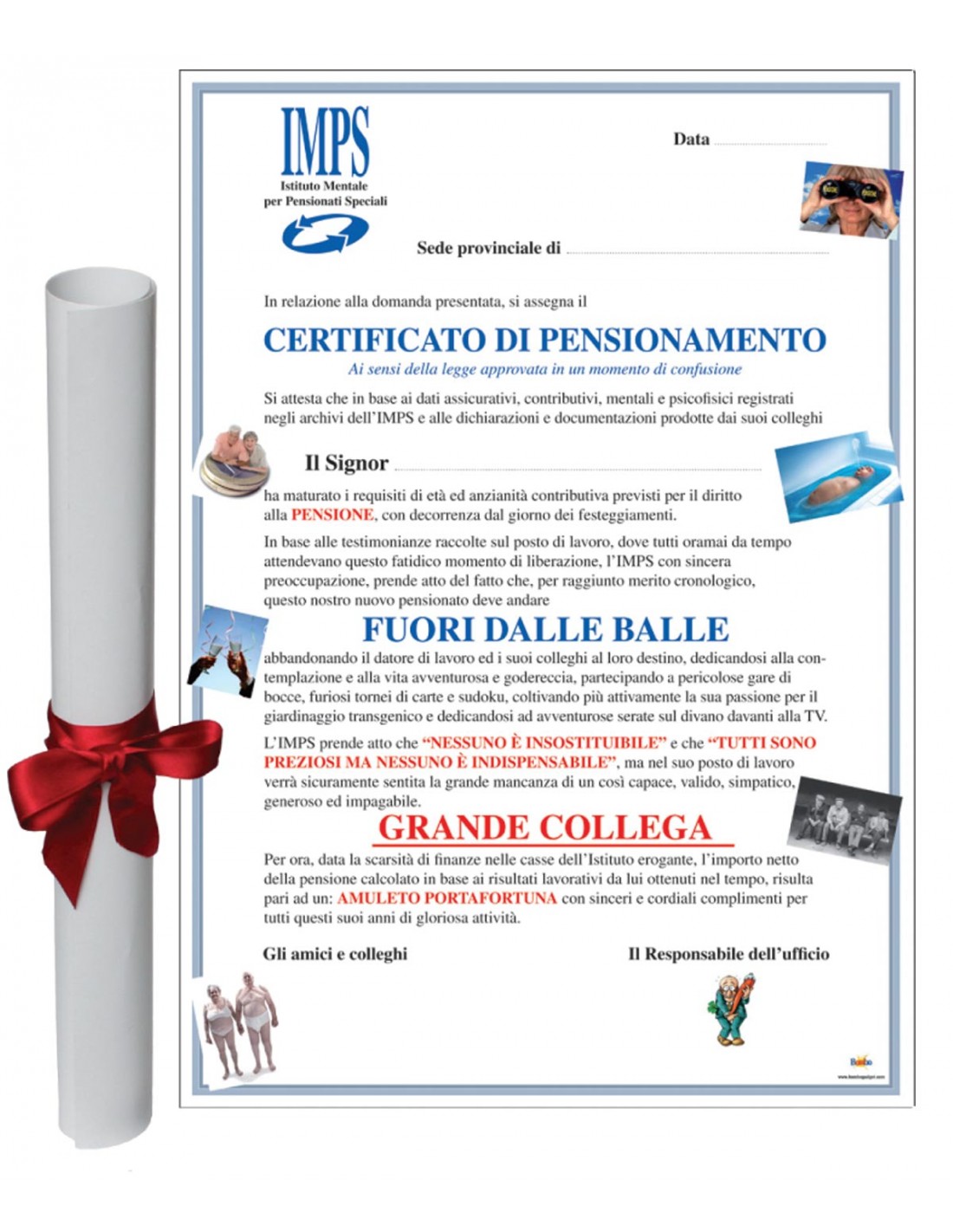 Grazie all’IMPS Istituto Mentale per Pensionati Speciali, che certifica la validità e i requisiti di anzianità, il tuo collega, amico o parente, troverà allegato a questo attestato di maturità pensionistica, anche un cornetto rosso, come amuleto portafortuna che lo preserverà dalla sfiga di non poter più ricevere l’agognata Pensione a causa della possibile scarsità di fondi nelle casse di questo umoristico Istituto Previdenziale