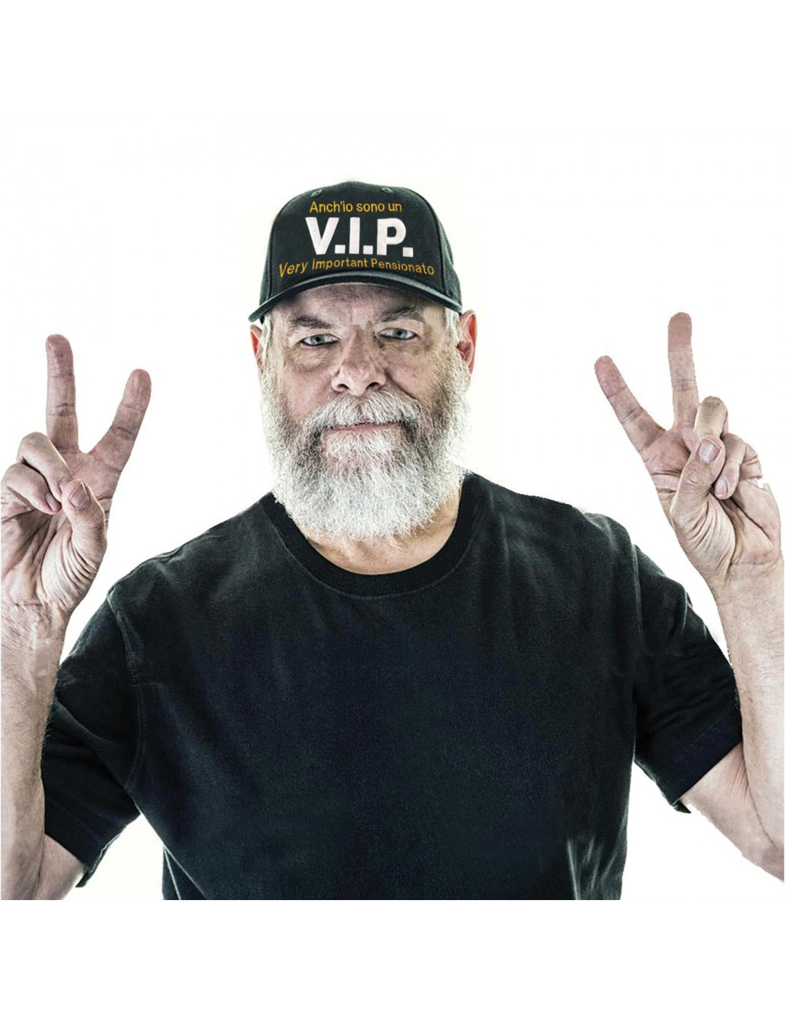 Il cappellino da pensione con scritto "Very Important Pensionato" è un berretto in cotone nero con visiera, modello baseball,  in taglia unica, adattabile grazie alla pratica regolazione in velcro e visiera per un’efficace riparo dai raggi solari.