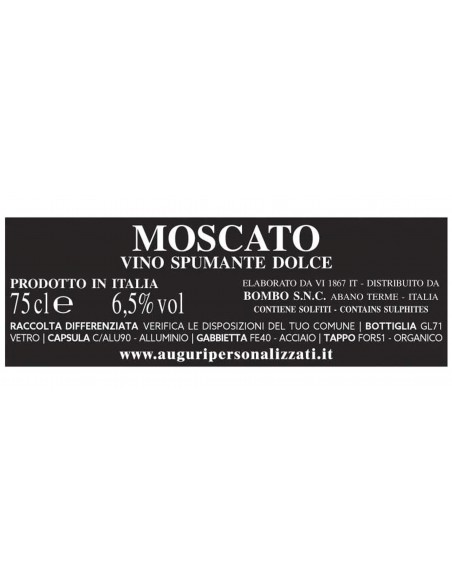 Per questa bottiglia celebrativa abbiamo scelto un vino Moscato D.O.C., dolce al palato, giallo paglierino e dal fine perlage.
