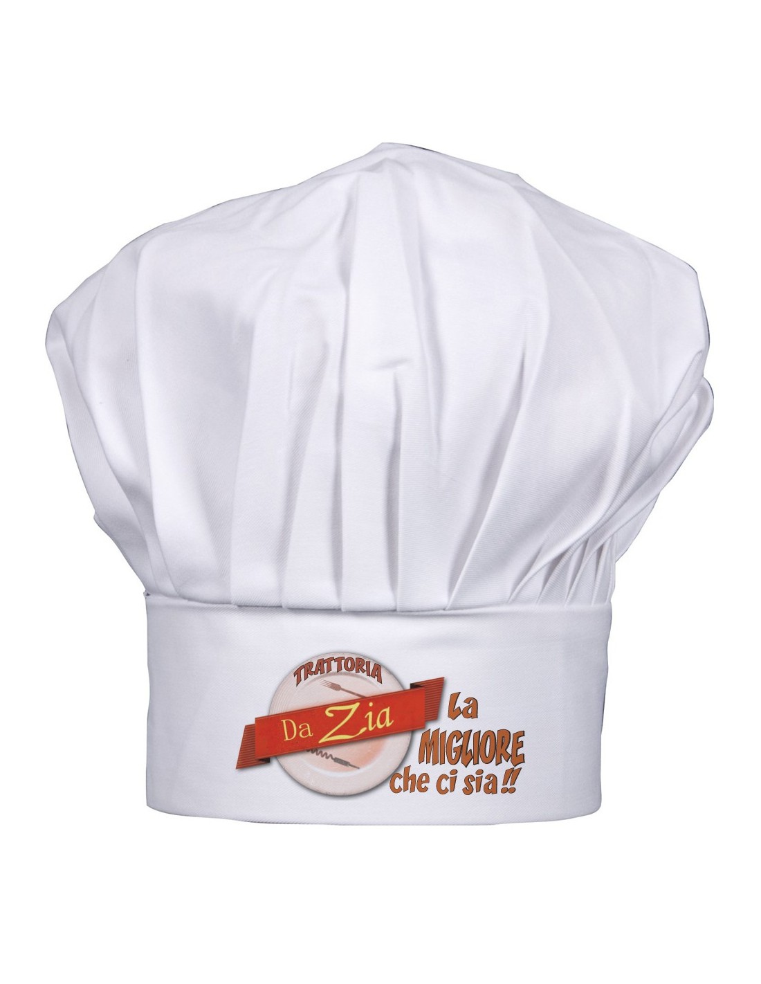 Elegante copricapo riservato ai veri chef. Sulla parte frontale, in bella vista, campeggia la scritta stampata "Trattoria da Zia. La migliore che ci sia!".Disponibile in un'unica taglia regolabile.