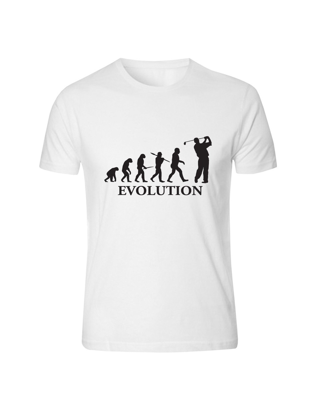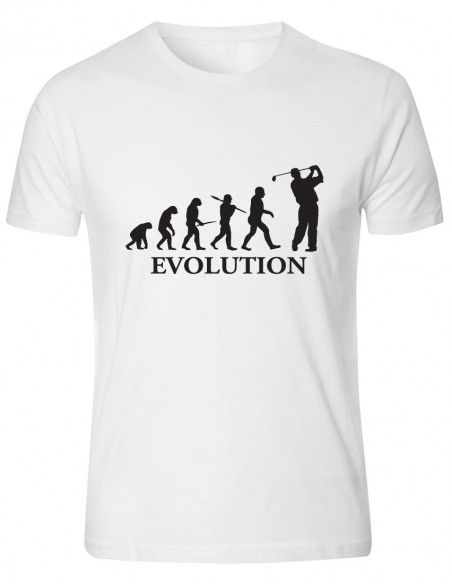 L'immagine stampata sulla t-shirt, ritrae l'evoluzione dell’essere umano da primate a Homo Erectus pronto al colpo, col tipico movimento top spin, impugnando ferri, legni e putter.