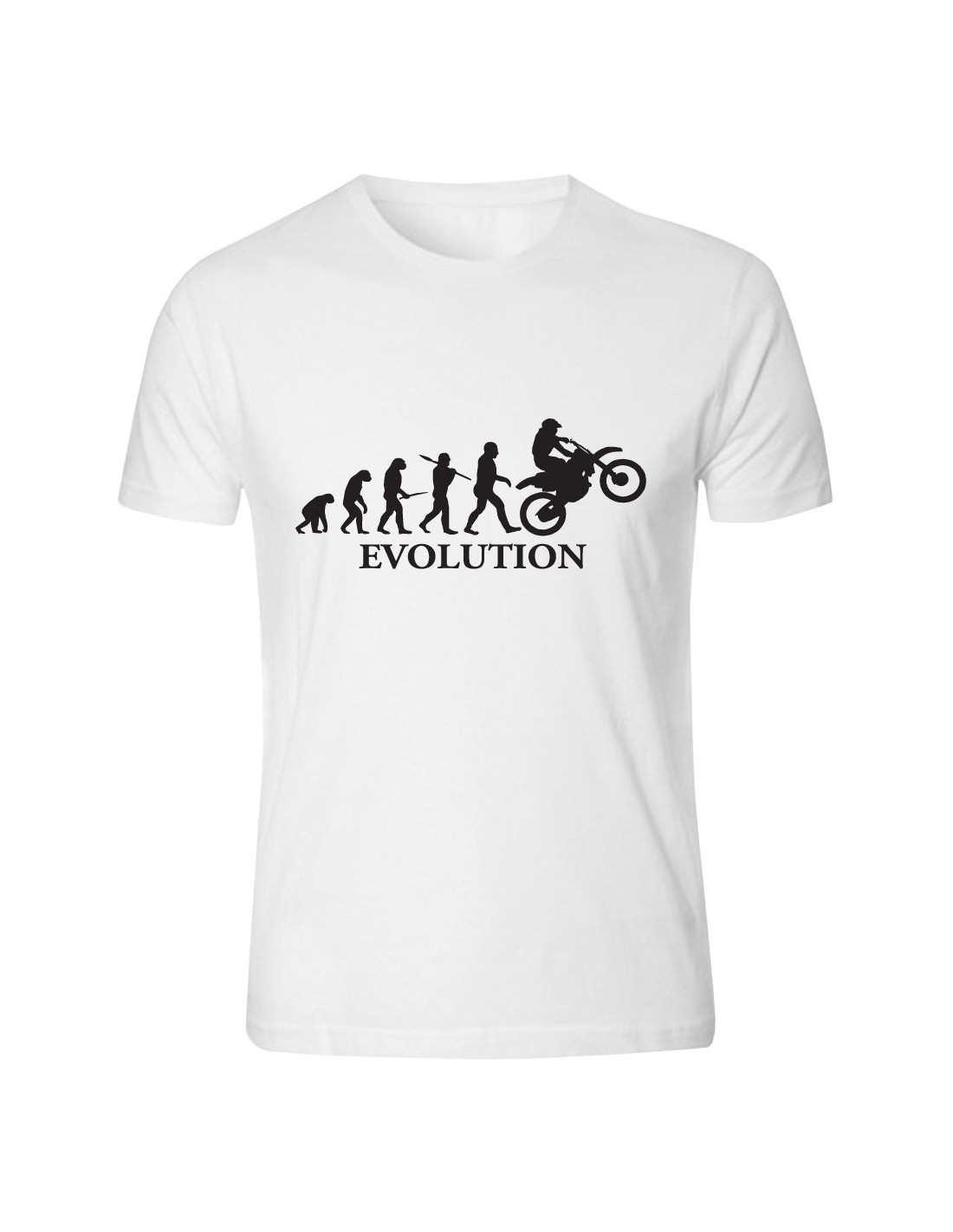 La maglietta Evolution motocross è una t-shirt dalla grande capacità ironica, perché riproduce l'immagine scientifica dell'uomo che si evolve da scimmia, a Homo Erectus ed impennato. Senza dubbio un divertente capo di abbigliamento in cotone al 100% ideale per chi ama il motociclismo, mettendo in evidenza questa innata passione con un bellissimo e sottile pizzico di ironia: non può mancare nell'armadio di un motociclista incallito, amanti del cross e del trial