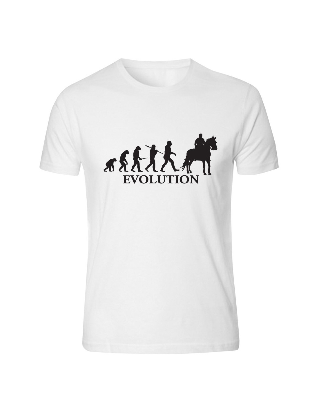 La nostra t-shirt Evolution ippica, si rifa' alla teoria di Darwin, dove la scimmia piano piano si evolve in Homo Erectus ...in groppa al cavallo.