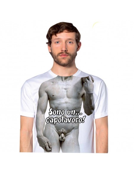 Maglietta bianca a maniche corte. Lo sfondo e' perfetto per far risaltare la stampa impressa, del David di Donatello accompagnata dalla scritta "Sono un capolavoro". Un capo d'abbigliamento simpatico a tal punto da movimentare con risate e divertimento la festa del tuo migliore amico.