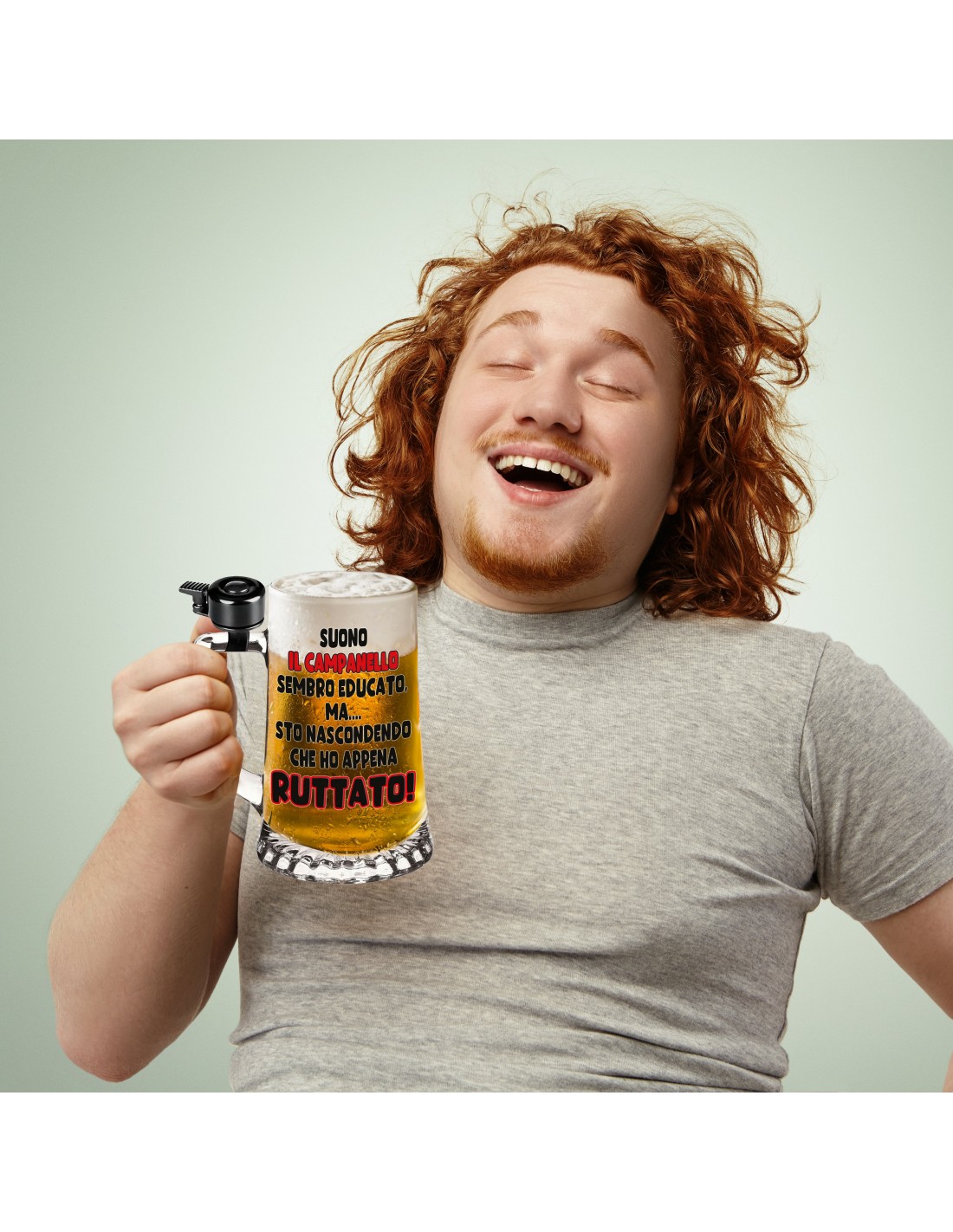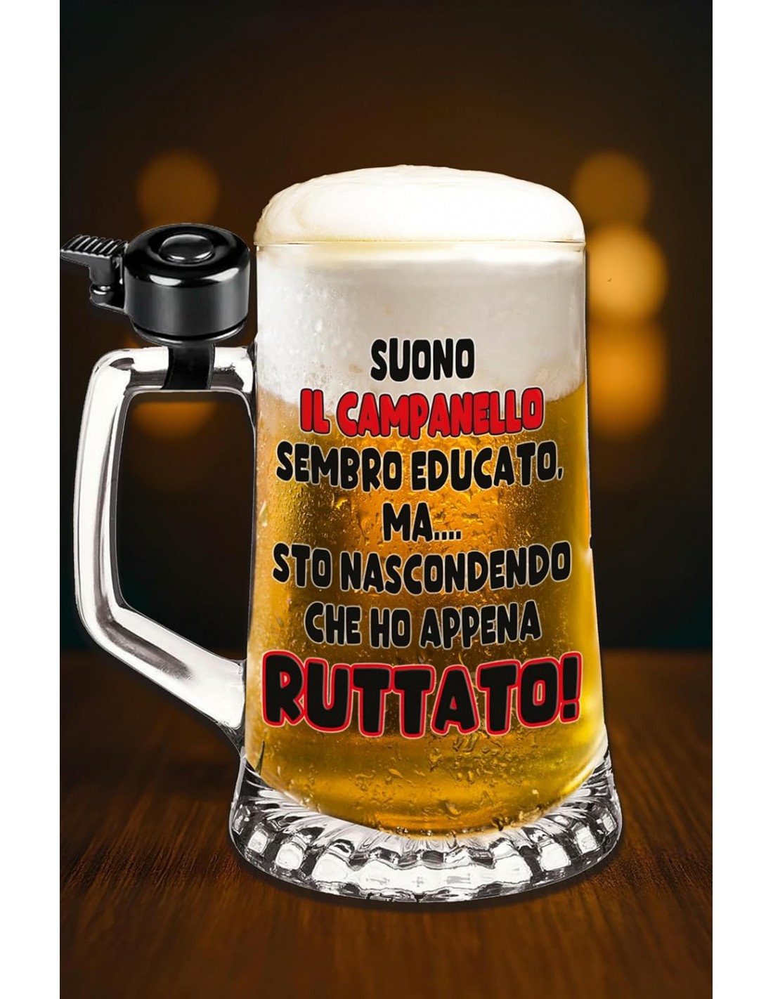 Il bicchiere da birra in vetro con campanello e scritta irriverente è il regalo perfetto per quell’amico che:
