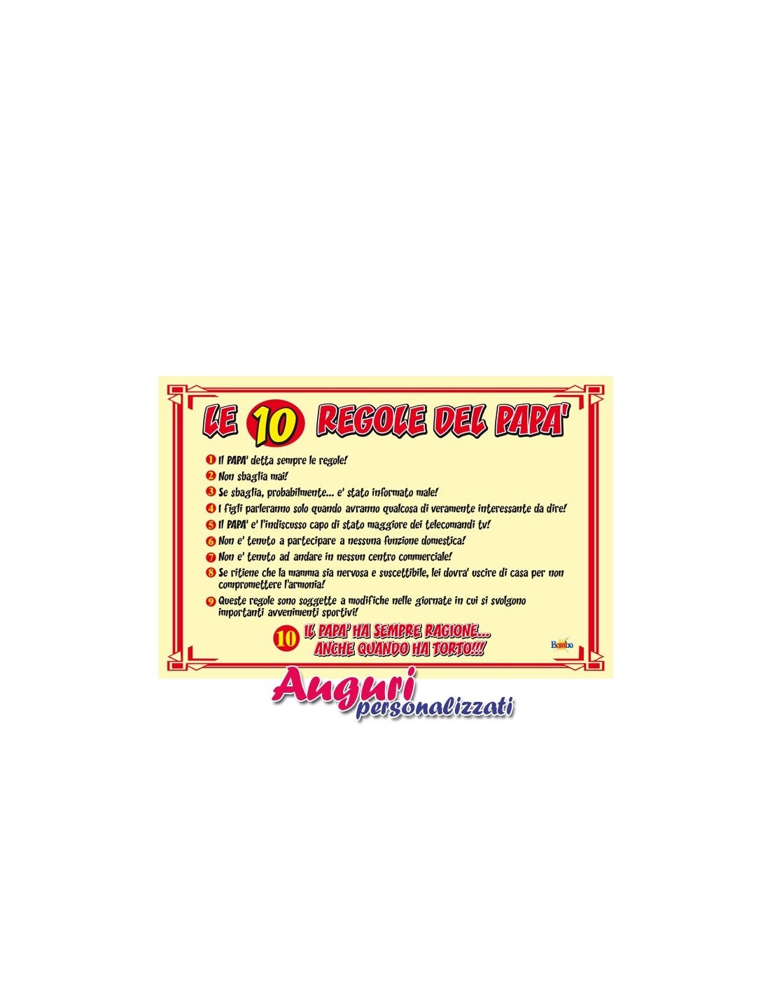 Se il tuo babbo è il grande mito della famiglia, non puoi fare a meno di regalargli questo fantastico zerbino per il papà con decalogo. Con le dieci regole presenti puoi dirgli quanto gli vuoi bene e dimostrare a tutti quanto lui sia importante per te. In effetti, è proprio vero: il Papà non sbaglia mai!