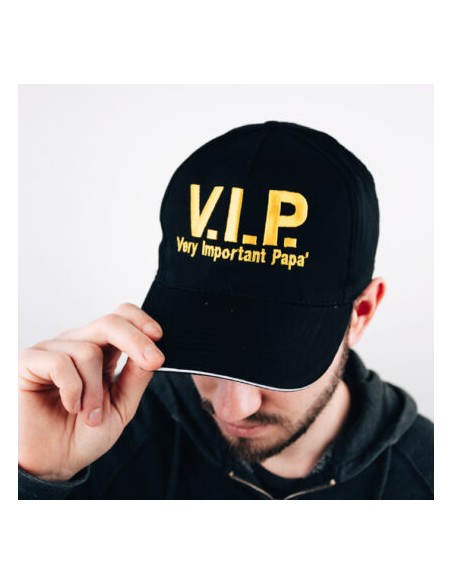 Il nostro cappellino in cotone nero con visiera, ricamato con la scritta “V.I.P. Very Important Papàè un ottimo capo d'abbigliamento casual e divertente per ogni occasione in cui Papà ci tenga a dimostrare quanto sia così importante per i suoi eterni “bambini”.