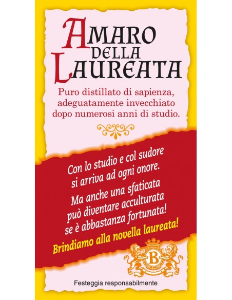 L’idea particolare e’ la confezione di questa t-shirt, perche’ è sigillata in una bottiglia marrone di liquore in vetro da 750 ml, simile a quelle che contengono famosi marchi di amari, ecco perche' sull'etichetta la scritta "Amaro della Laureata".