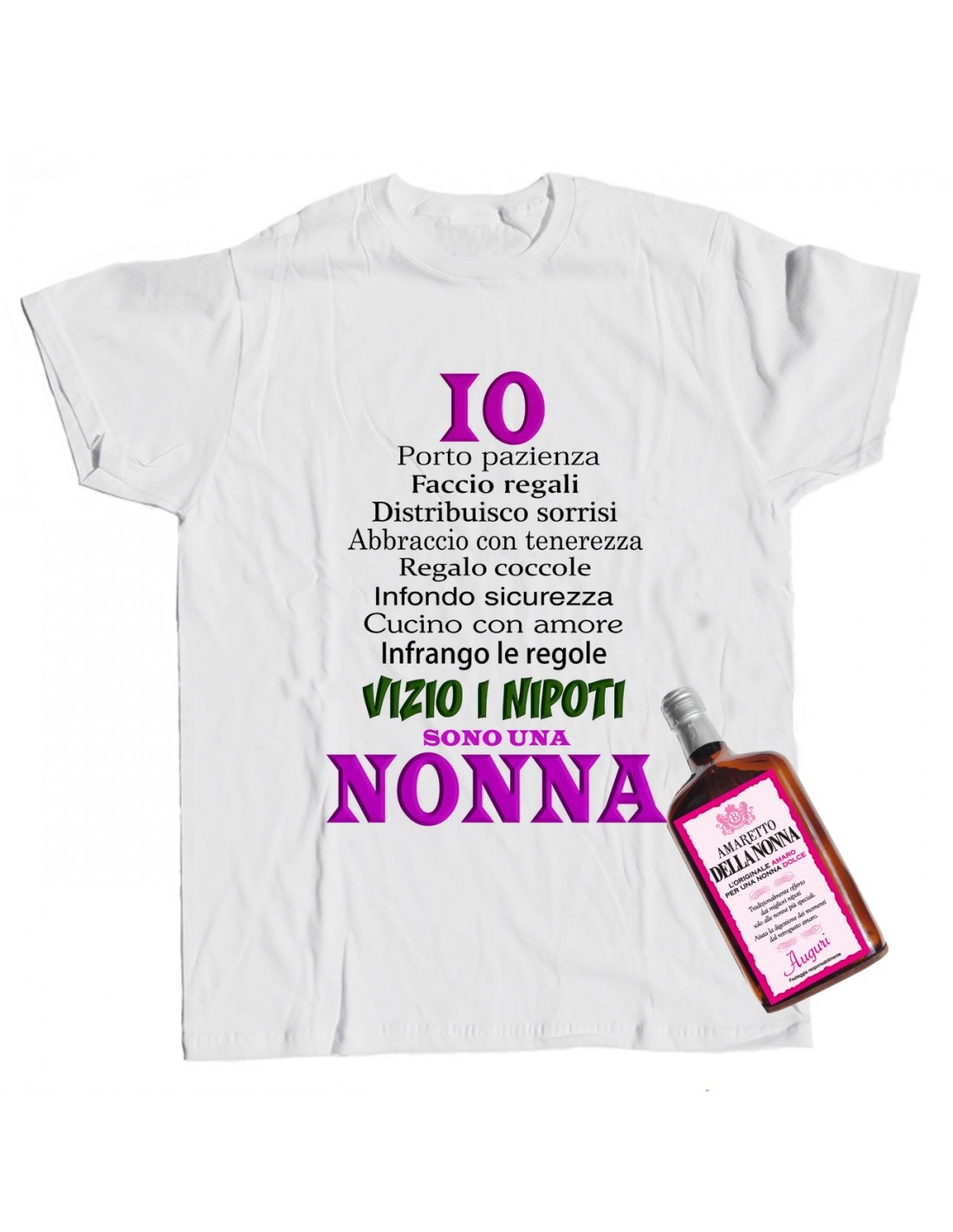 La bottiglia di Amaretto della Nonna contiene una t-shirt che conquisterà per l'originalità anche la nonna piu' brontolona, trasformando un semplice dono in un’esilarante momento di festa.