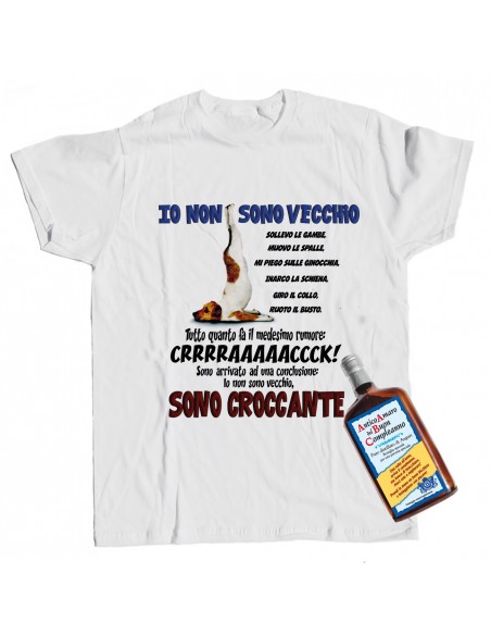 Regalo particolarmente ironico sul fisico datato del festeggiato, che ad ogni piccolo esercizio fisico... scricchiola! La bottiglia e' etichettata come una normalissima bottiglia di Amaro e dal fondo, togliendo il tappo di legno che la sigilla, potra’ estrarre la sua divertente t-shirt che sfoggera’ con orgoglio, raccontando un po’ a tutti che si tratta di un regalo di una persona spettacolare