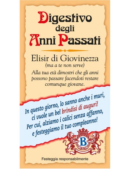 T-shirt di compleanno inserita in una bottiglia sigillata di vetro brunito da liquore con etichetta del Digestivo degli Anni che passano, ecco un dono ideale per quelli come te che cercano sempre qualcosa di nuovo e originale per divertire e stupire amici e parenti alle feste.