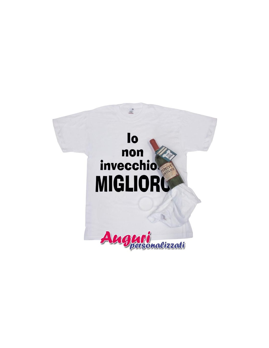 Regala questa bottiglia di vino, dove all'interno trovera' una t-shirt bianca con la scritta "Io non invecchio MIGLIORO" motto che dimostra quanto gli anni che sono passati, abbiano avuto sul suo corpicino solo effetti positivi se non addirittura migliorativi e ribadire che il tempo che passa ha fatto bene al festeggiato, come succede per un buon vino d'annata.