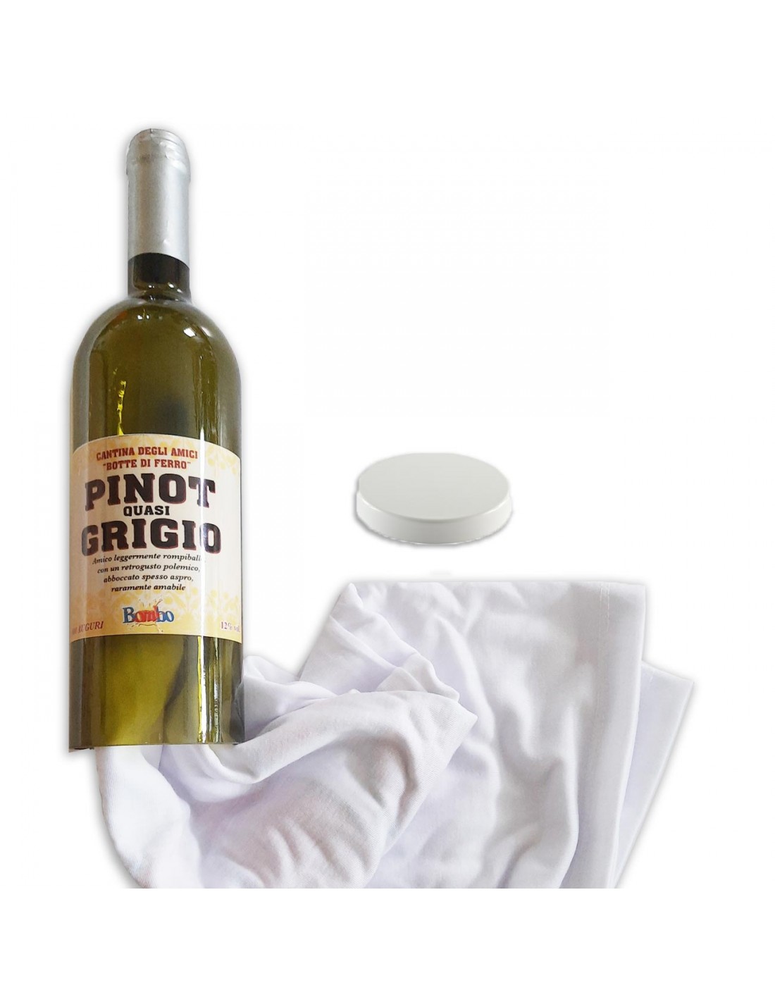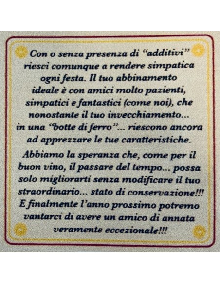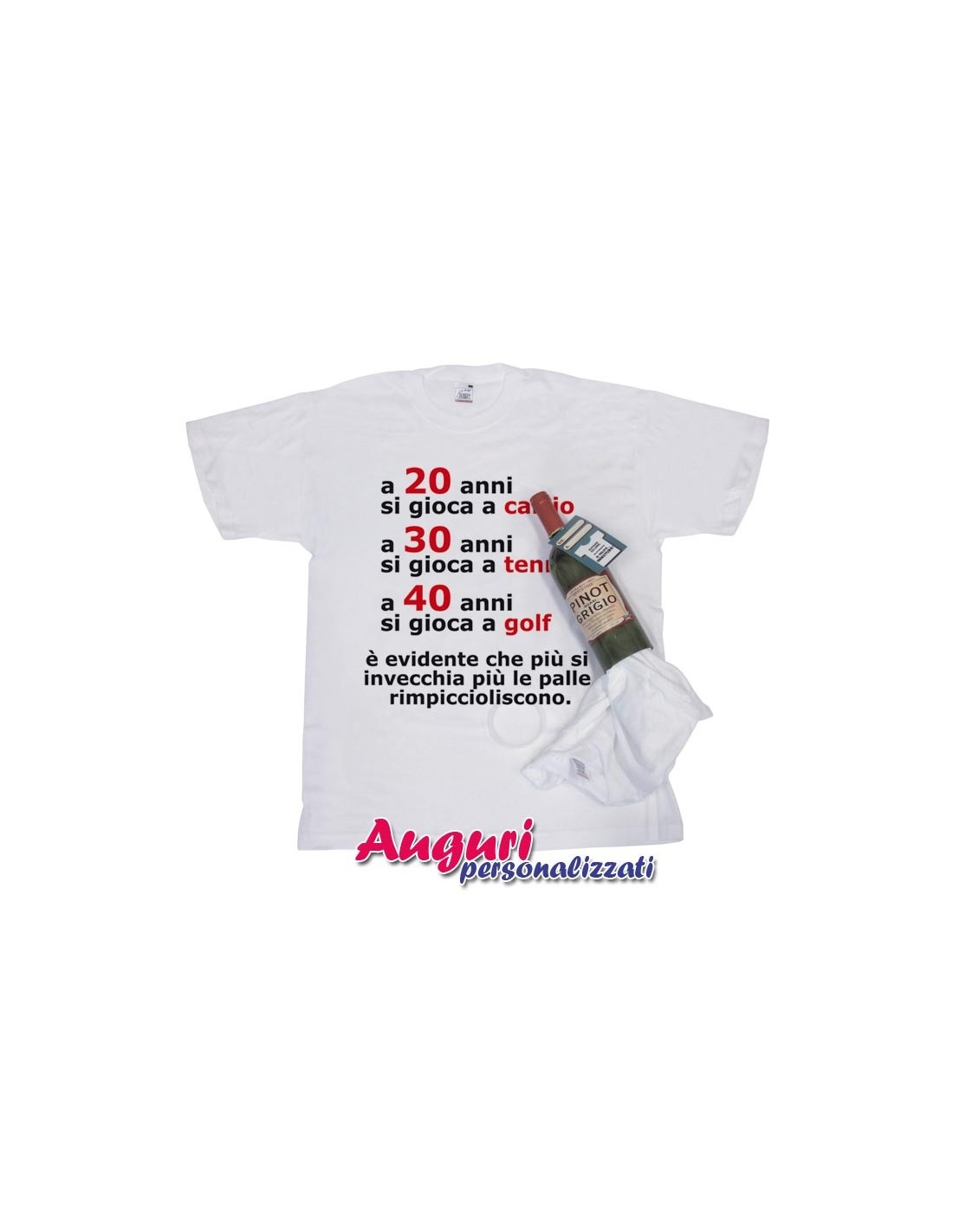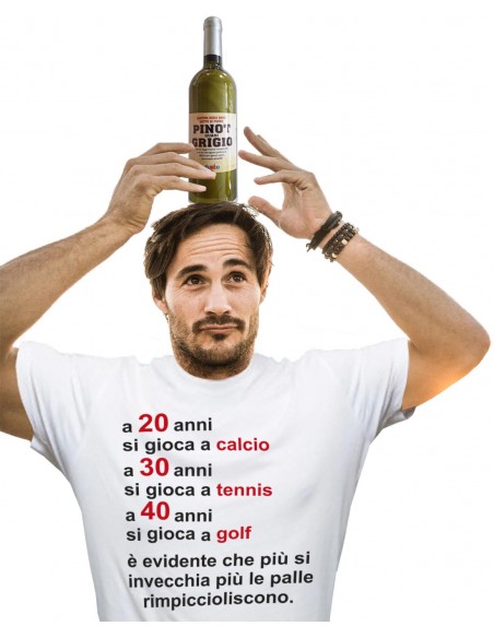 Vuoi farti ricordare da un amico col quale hai confidenza e sfotterlo un po' per il passare degli anni, ecco una bottiglia di vino buono con dentro una t-shirt ironica.
