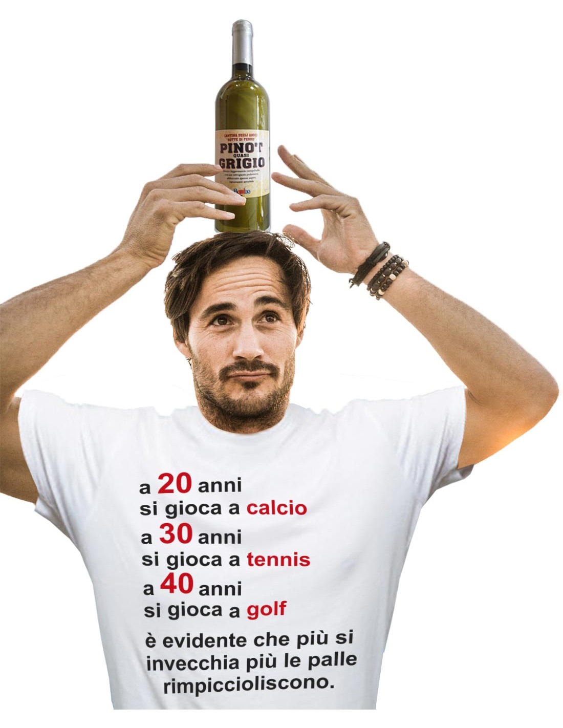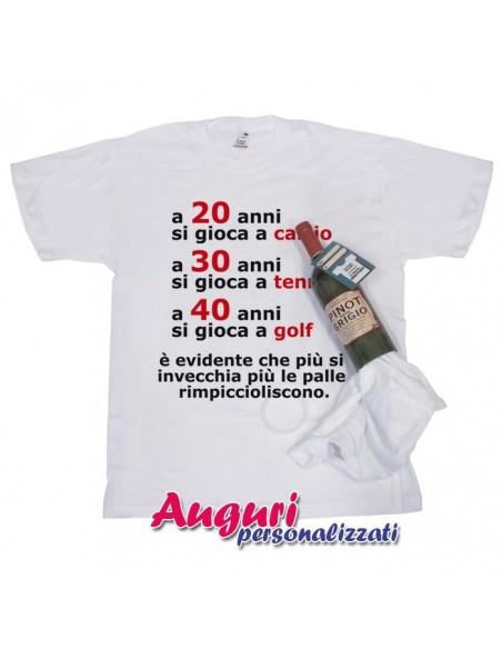 T-shirt in bottiglia "Più si invecchia e piu' le palle rimpiccioliscono" per uomini sportivi che festeggiano i 20, 30 o 40 anni e non solo, ricordando loro che con l'aumentare degli anni, dovranno dedicarsi ad altri sport