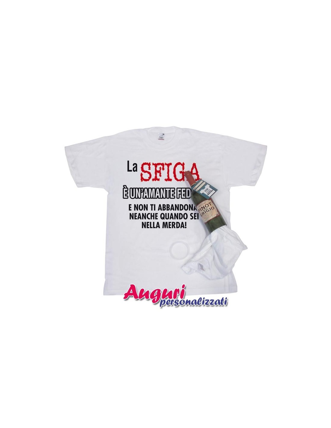 Hai un amico che viene particolarmente evitato dalla dea della fortuna? E’ anche una persona ironica? Non farti sfuggire l'occasione di regalargli la maglietta in bottiglia per uno sfigato: nella T-shirt compare la divertente scritta La sfiga è un'amante fedele e non ti abbandona neanche quando sei nella merda! perciò è indicata per chi sa ridere delle proprie disavventure.