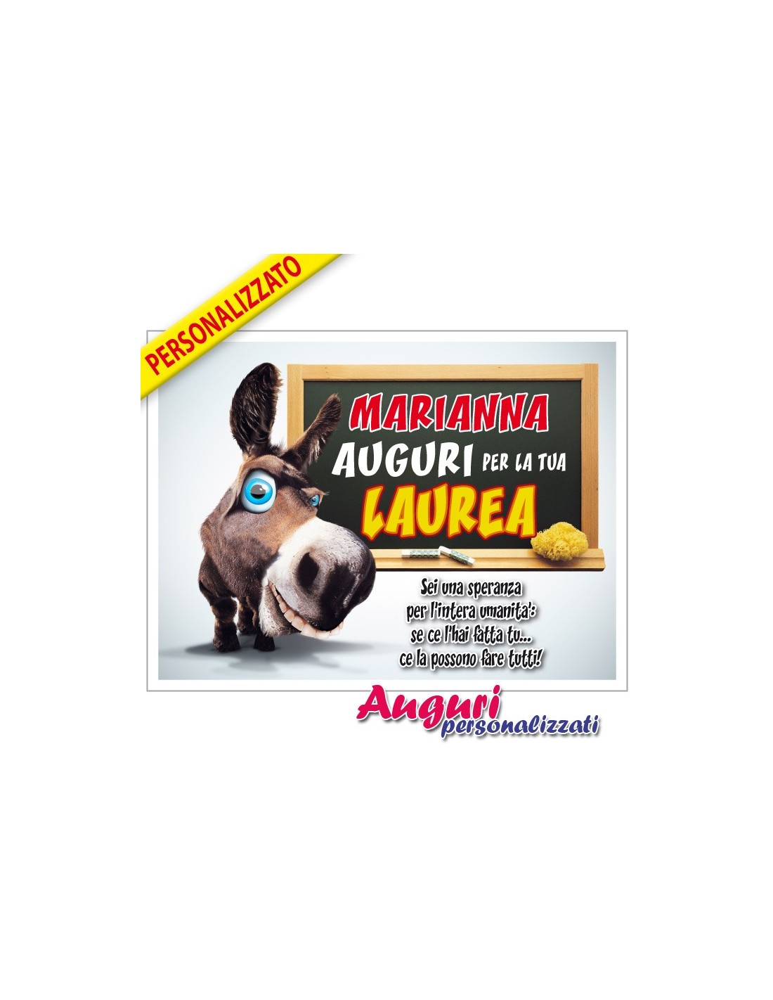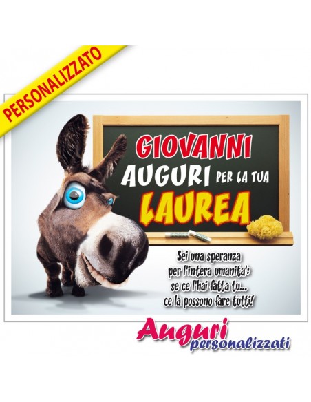 Divertente articolo per completare la festa di Laurea, specialmente se appeso al collo del neo-Dottore, sarà esilarante vederlo girare con un asinello che sorride. La personalizzazione poi è molto veloce: ti basterà inserire il suo nome al momento dell'ordine!