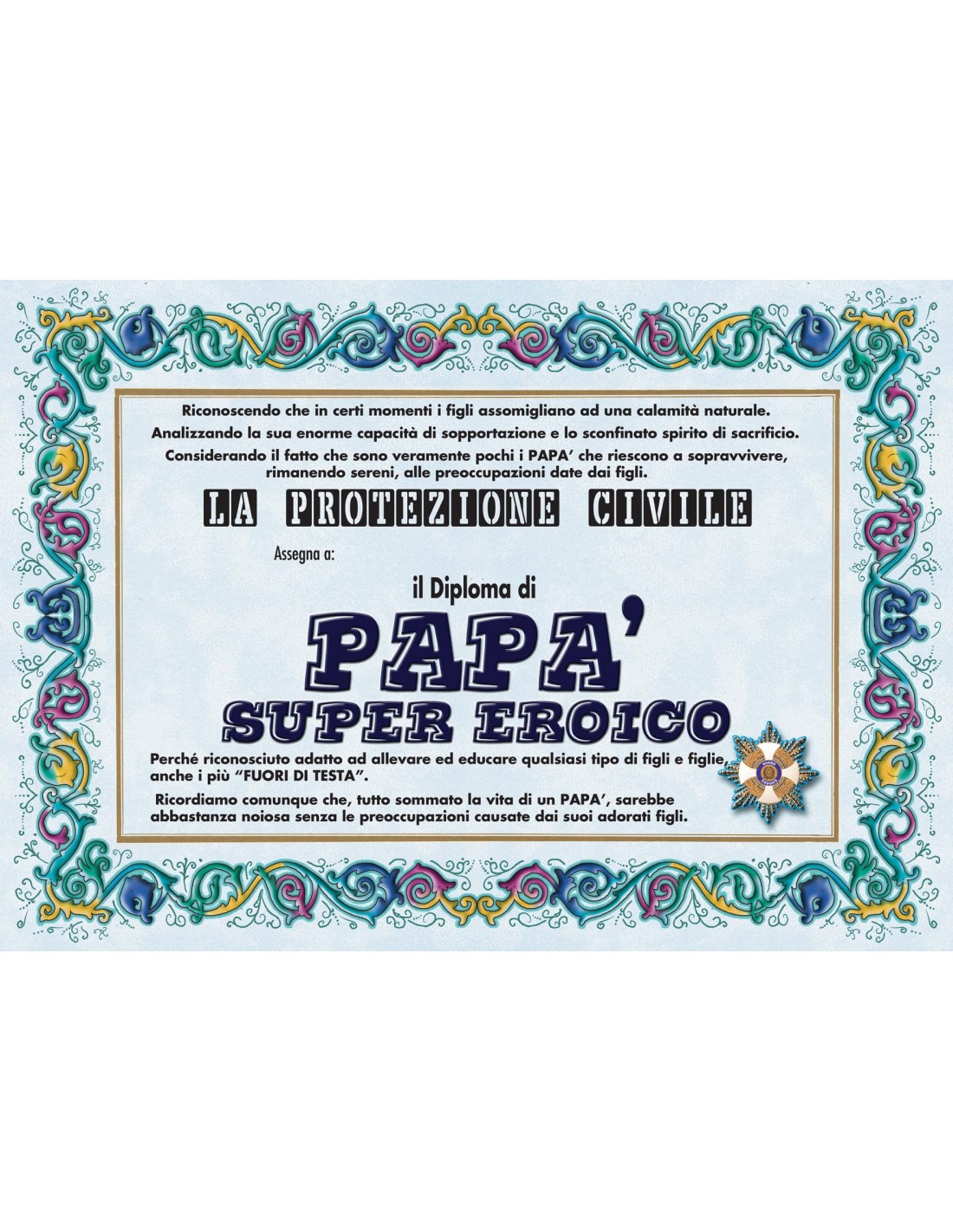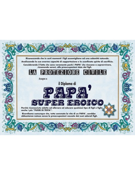 Potrai organizzare una simpatica cerimonia ufficiale, durante la quale, alla presenza di parenti e amici, declamerai solennemente le grandi doti del tuo babbo, così grandi che la Protezione Civile ha addirittura deciso di proclamarlo SUPER.