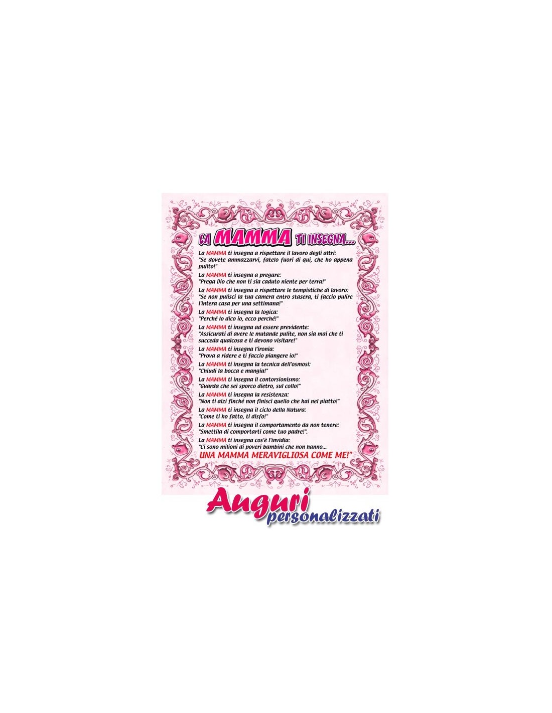 Targa è in metallo, di cm.40 x 30 , stampata con alcuni degli insegnamenti storici di ogni mamma, accompagnati da spassose citazioni: lei ti insegna a pregare (prega Dio che non ti sia caduto niente per terra!), oppure ti insegna l'ironia (prova a ridere e ti faccio piangere!). L'ultimo degli insegnamenti è forse il più importante, la mamma ti insegna cos'è l'invidia: ci sono milioni di poveri bambini che non hanno...una mamma meravigliosa come me!