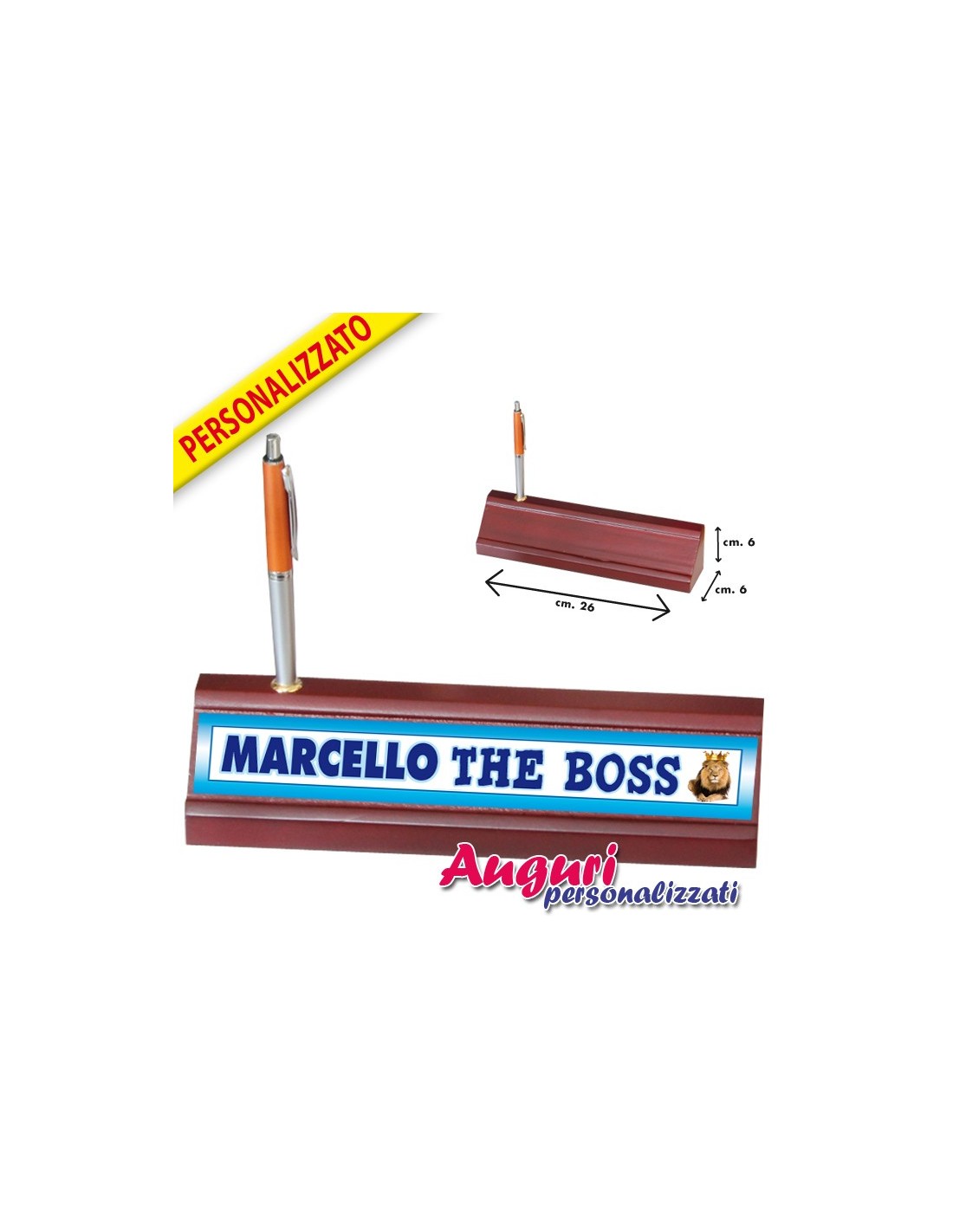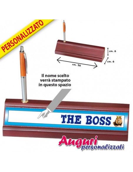La targa personalizzata da scrivania per il capo è in legno ed è completa di penna. E' personalizzabile ovvero si può stampare il nome del destinatario del regalo. Non occupa troppo spazio sulla scrivania avendo una forma a prisma triangolare con una lunghezza pari a 26 cm per uno spessore di 6. Sul lato principale vi è l'etichetta personalizzabile dove si stamperà il nome del destinatario con affianco la scritta a caratteri maiuscoli "THE BOSS" e la simpatica foto di un leone con la sua corona da re della savana. (Scorrendo le foto è possibile vedere un esempio di personalizzazione)
