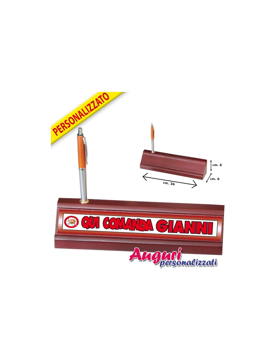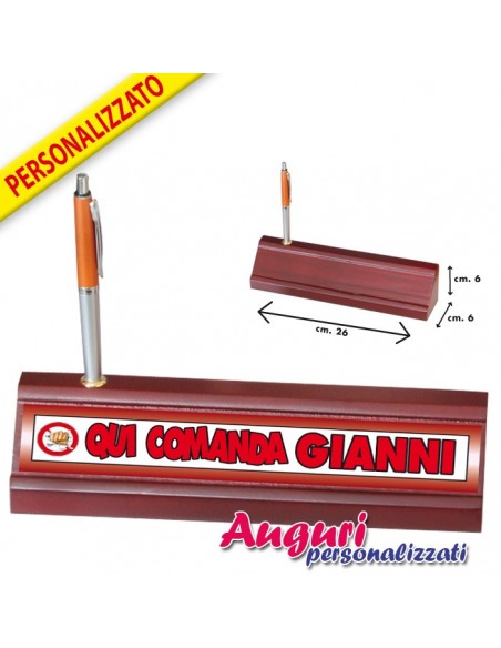Il porta nome da scrivania per chi comanda è un regalo duraturo e resistente: è infatti realizzato in legno ed è robusto e di ottima qualità. L'articolo è largo 26 cm, alto e profondo 6 cm, risultando in questo modo poco ingombrante e adatto a qualsiasi scrivania, anche a quelle più piccole. Il porta nome è completo di penna e non passa mai inosservato nella sua semplice eleganza. L'oggetto possiede la scritta "qui comanda", da completare con il nome della persona festeggiata, alla quale farai un regalo diverso dal solito e per nulla banale.