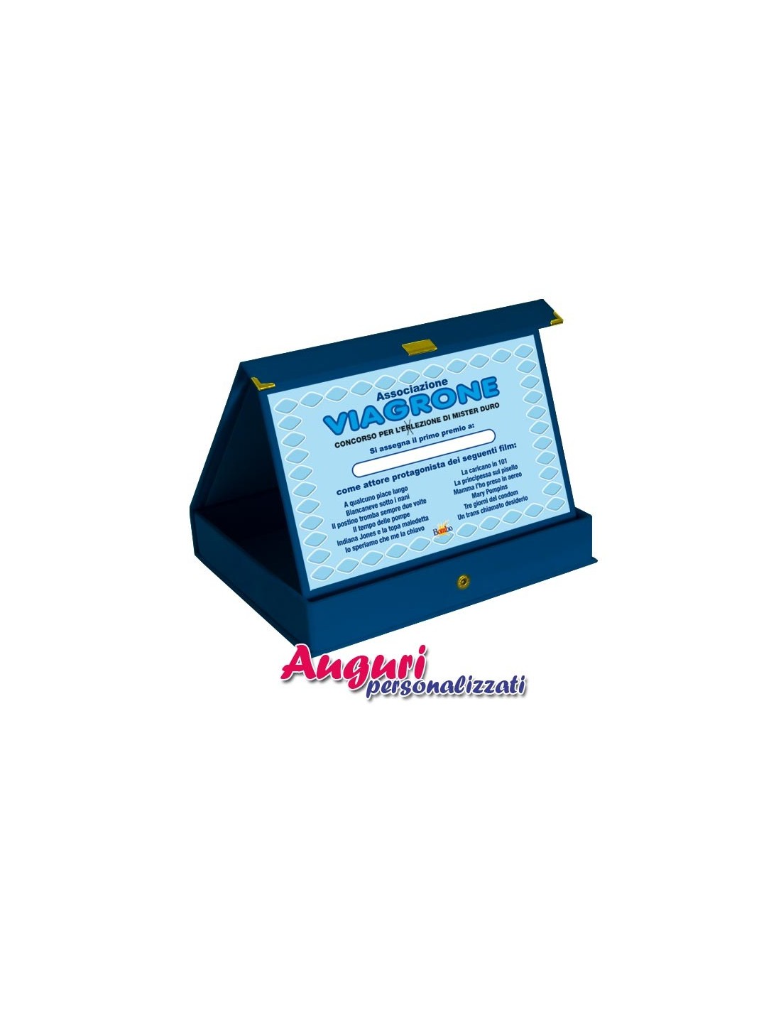 La targa sexy Mister Duro è di colore azzurro e può essere personalizzata inserendo il nome della persona che ricevera' l'ambito premio dell'associazione Viagrone. Realizzata in TNT con interno in velluto e contenuta in un'elegante scatola blu che può essere utilizzata per esporre la targa stessa. Ovviamente trattandosi di un riconoscimento ambito, ma particolare, meglio scegliere un contesto privato, mostrando poi la targa solo a qualche amica speciale.