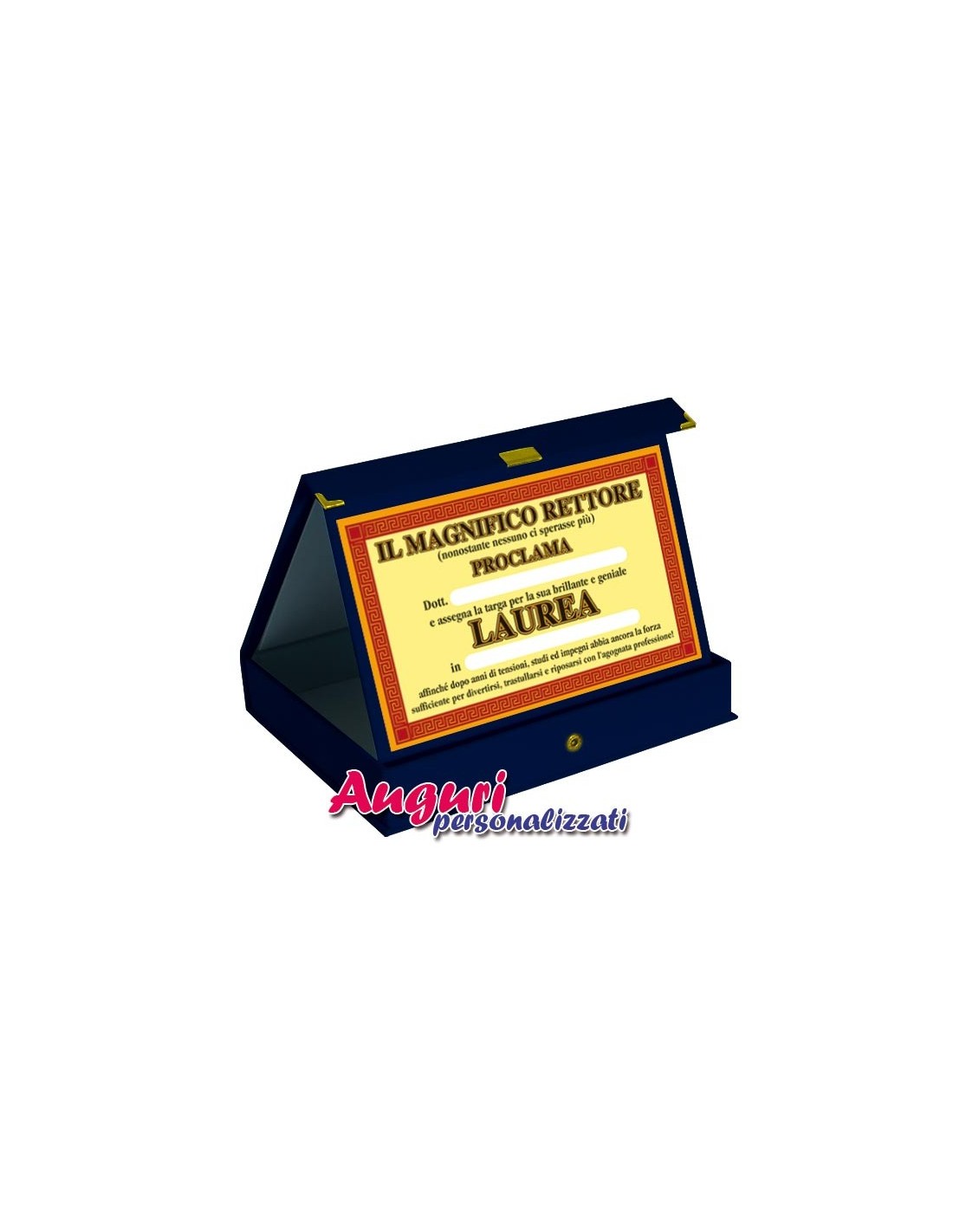 L'astuccio in legno foderato in TNT blu, contiene un supporto in velluto dove è applicato il colorato cartoncino commemorativo con la possibilità di personalizzarlo con Nome e Facoltà