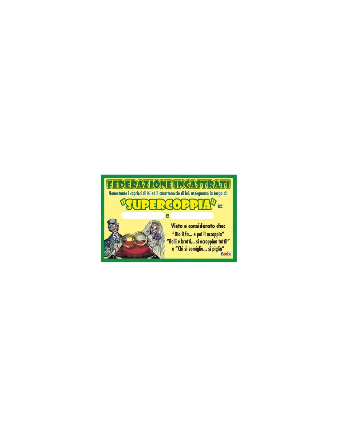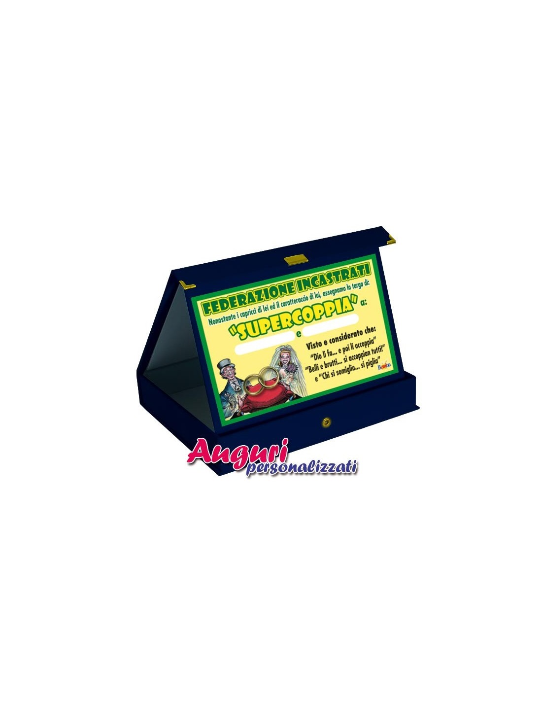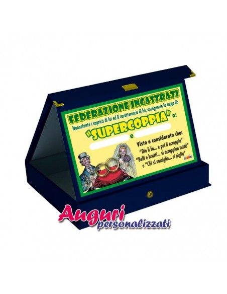 Questo trofeo alla coppia, e’ formato da un cartoncino stampato con applicati  2 anelli in ottone  simili a 2 fedi nuziali , con dedica e su due appositi spazi, dove  potrai scrivere personalmente, con un pennarello, i nomi o i nomignoli con cui si chiamano tra loro i 2 amanti  Questo fara’ in modo che diventi un dono ancora piu’ intimo e personale.