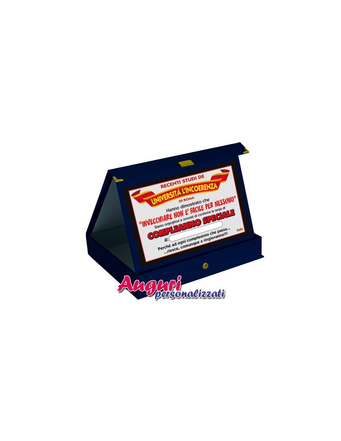 La targa si presenta in modo elegante, grazie al cofanetto blu rettangolare in legno foderato in TNT che misura 17 x 21 cm. L'interno in velluto blu accoglie la simpatica targhetta su cui sono stampate esilaranti battute, aneddoti sull'età, auguri personalizzati per un compleanno favoloso.
