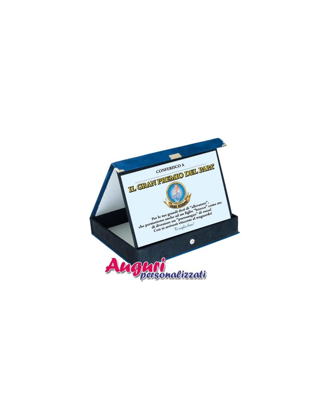 La targa Gran Premio del Papà e stampata su cartoncino colorato sul quale e’ possibile scrivere con un pennarello, personalizzandolo con il nome di Papa’ sull’apposito spazio. Il cartoncino e’ applicato su un supporto in velluto, all’interno di una scatola di legno di cm.21 X 17, foderata in TNT blu e chiusa da un bottone automatico.