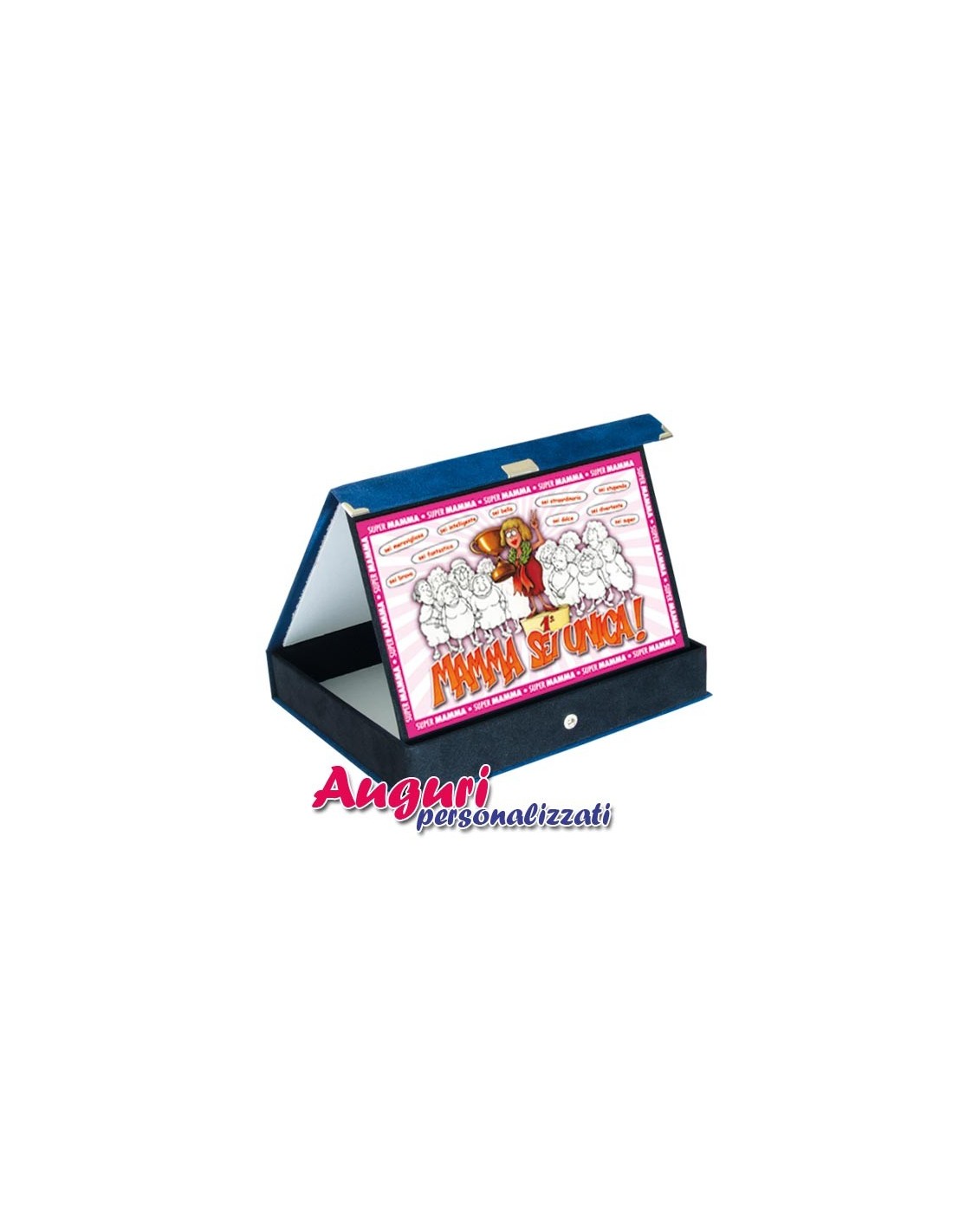 La targa è contenuta in un elegante cofanetto blu realizzato in t.n.t. con gli interni in morbido velluto grigio. Il gadget misura 21x17 cm ed è l'oggetto giusto per creare un'atmosfera ludica dedicata a una mamma favolosa. Sulla targhetta sono impresse frasi affettuose coloratissime e vivaci: la dicitura "mamma sei unica" è scritta in un eccentrico arancio. Il disegnino di una mamma che riceve una coppa dimostra la premiazione della protagonista della festa.