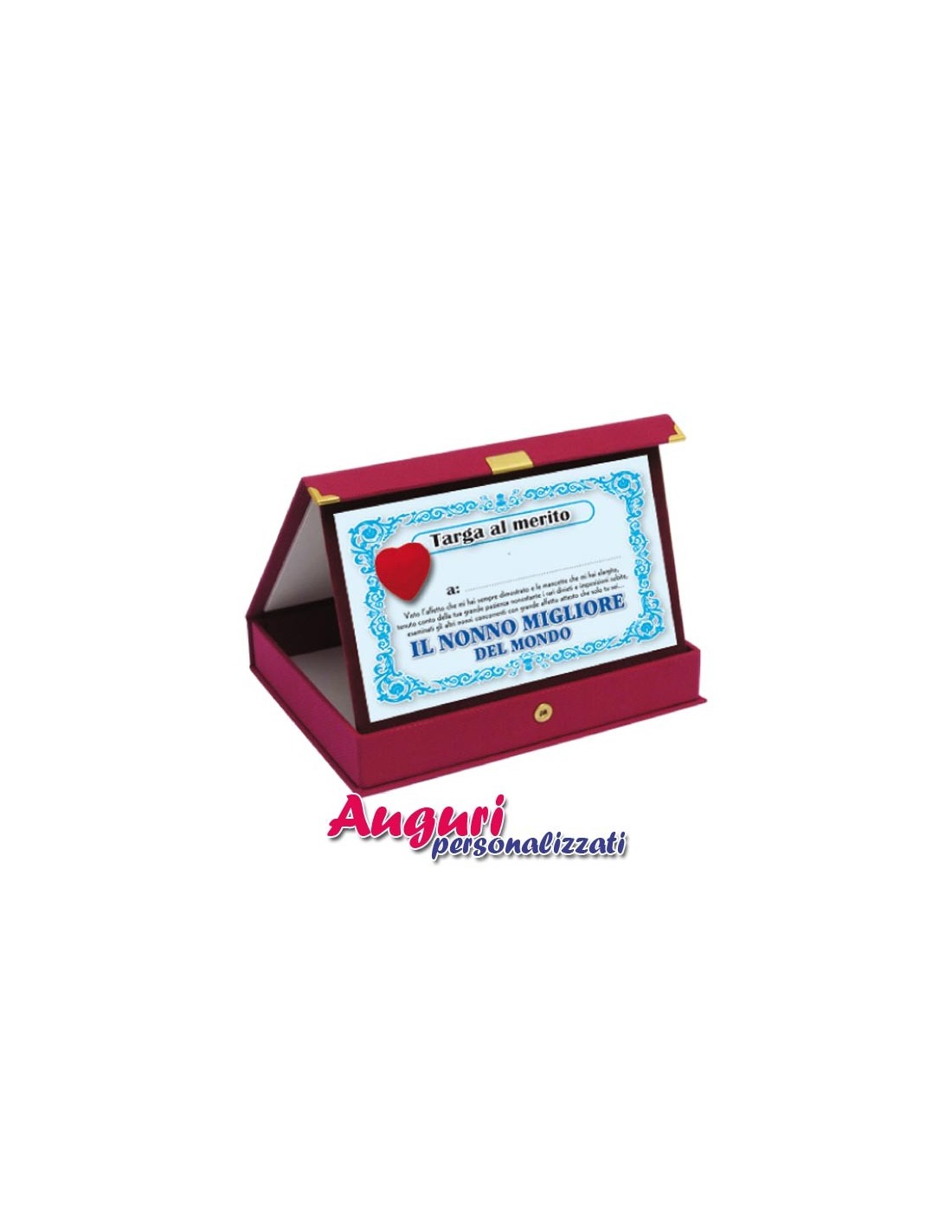 La targa premio di cm. 21 X 17, e’ formata da una scatola in legno foderata esternamente in TNT blu e all’interno in vellutino con applicato il cartoncino stampato con dedica e nome del Nonno e un cuoricino