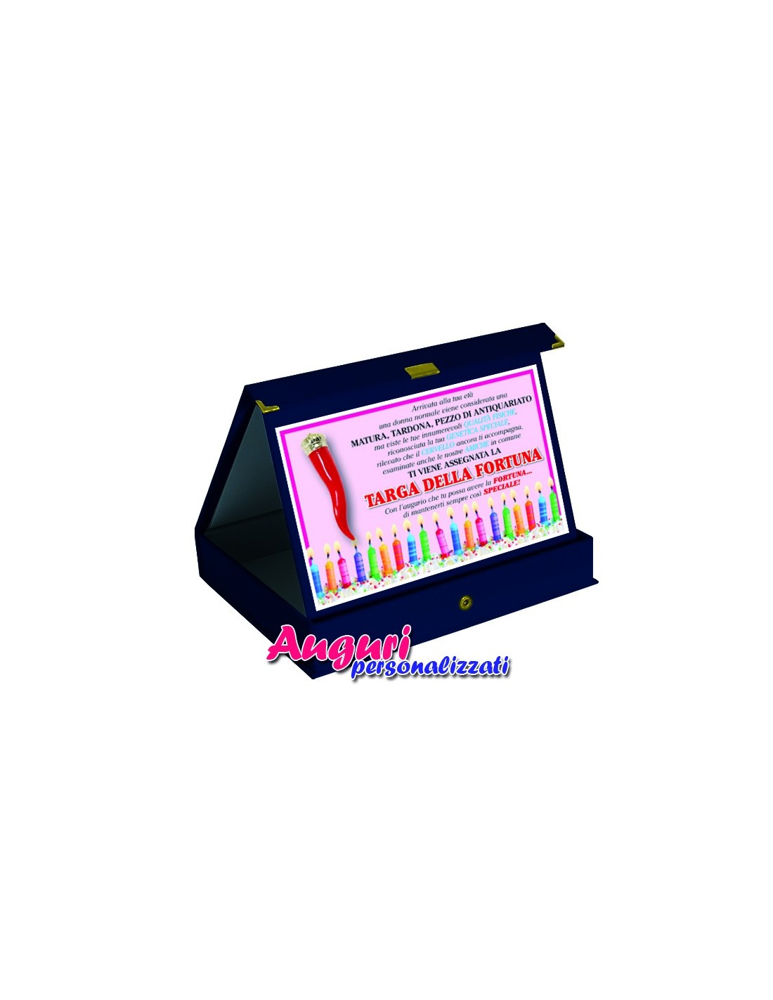 Questa elegante targa per un Compleanno fortunato, come le altre di questa ampia serie, e’ composta da un cartoncino colorato, applicato su un supporto in velluto, con incollato un cornetto rosso portafortuna, all'interno di una scatola in legno di cm. 21 X17 foderata in TNT blu e chiusa da un bottone automatico a pressione
