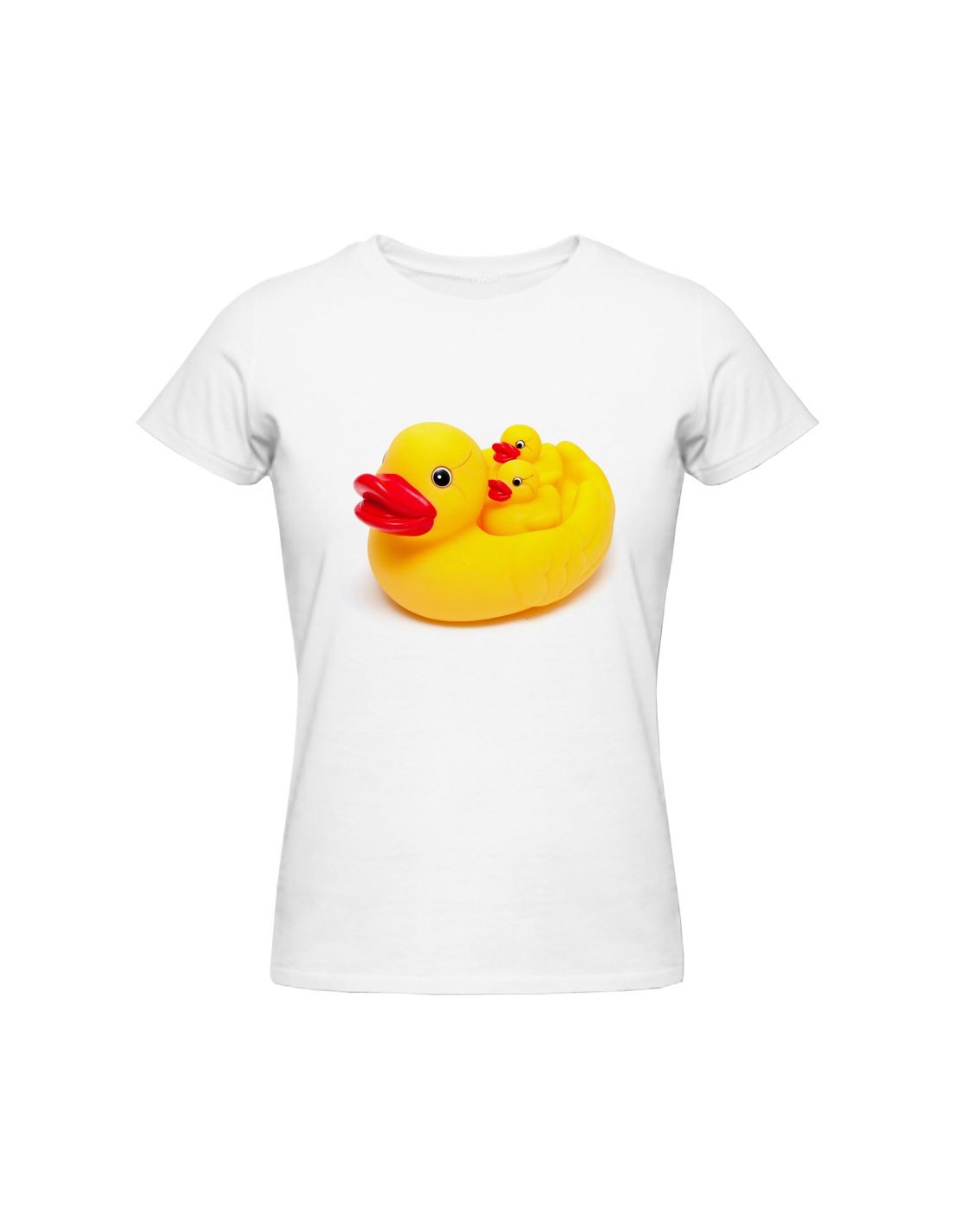 La stampa, originale e divertente, riprende l'immagine della famosa paperella di gomma gialla che oramai ha raggiunto lo status di icona nella cultura pop occidentale, i questo caso con la variante di portare sulla schiena due figlioletti paperotti